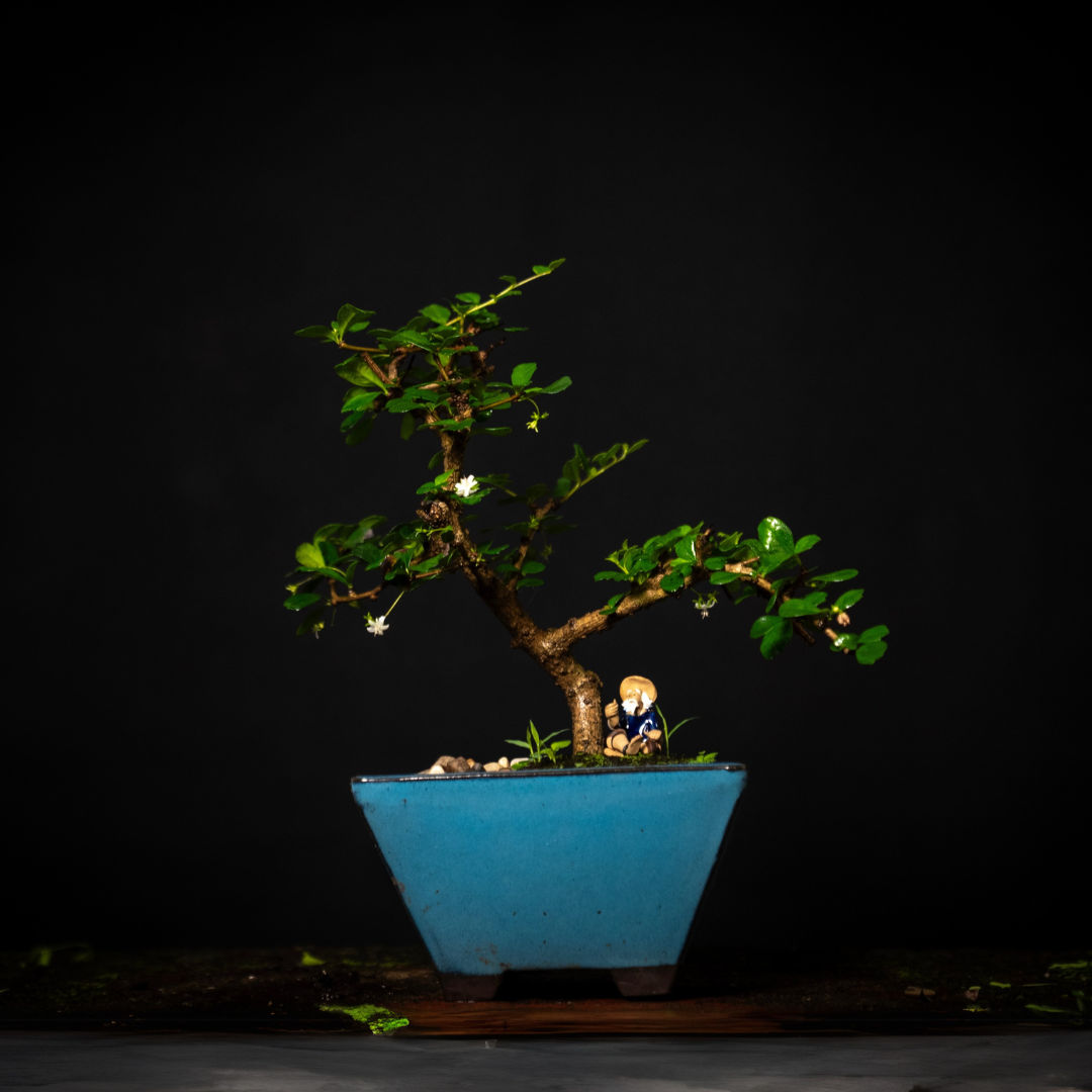 Bonsái de follaje perenne, conocido por sus hojas pequeñas brillantes y flores blancas. Ideal para interiores iluminados y de fácil cuidado.